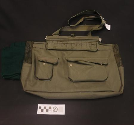 Grön axelväska. Innehåller en dagstidning och ett par handskar.