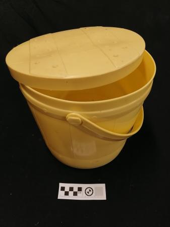 Gul hink i plast. Innehåller båtredskap.