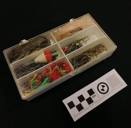 Vit dragask i plast med genomskinligt lock i plast. Innehåller drag och flöten.