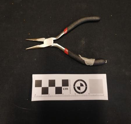 Tång med handtag av svart gummi.