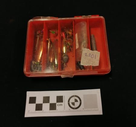 Dragask i röd plast med genomskinlgt lock. Innehåller drag.