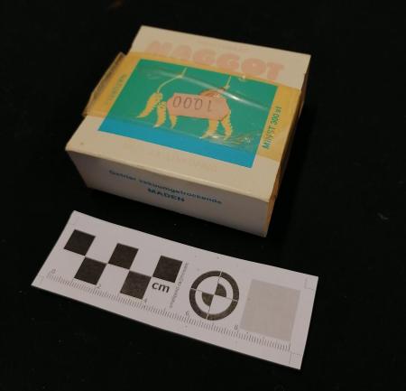 Oöppnad förpackning med torrfrysta maskar. Andvänds som bete i sportfiske.