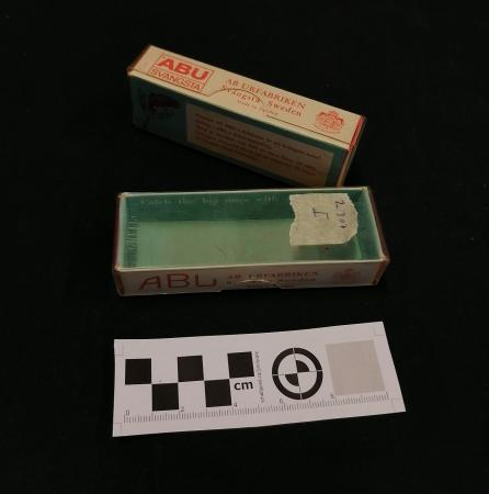 Två tomma vita kartongaskar för drag med vita, genomskinliga plastlock. I, II.