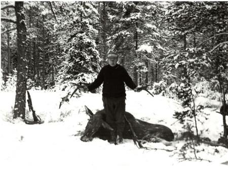 Baksidetext: Jens Harberg med en av honom nyss fälld älgtjur som tappade båda horn då den föll dö(?) 31/1 1977