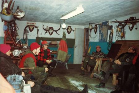 Baksidetext: Älgjakt i Lemland 1983. Samling i Sune Manséns garage. J.H.