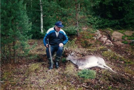 Baksidetext: 15/11 1994 vilthängsägaren Erik-Gunnar Eke med en nyss fälld dovhjort, Sund, Högbolstad