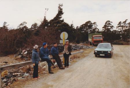 Baksidetext: Enklinge 1981. Cecilia Rehn, Einar Rehn, Hasse Häggblom, Ingmar Mattsson i väntan på färjan och hemfärd