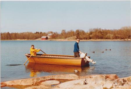 Baksidetext: Högholm, Lemland. (?) Bengt mäter avstånd från lund med blicken. Raimo i fören 1982. Vettaskytte