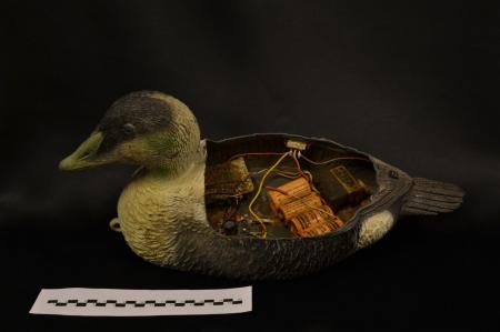 Ejder av plast vilken har öppnats i ryggen och en motor för radiostyrning har satts i. Utrustningen bedöms som dyr. Undertill en röd plastpropeller.