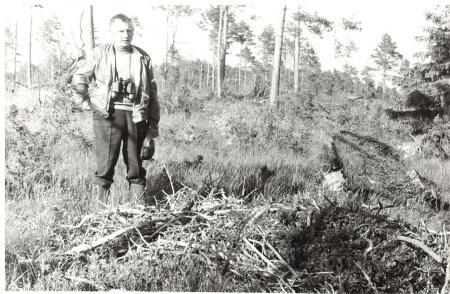 Baksidetext: Jens Harberg vid omkullsågat boträd för havsörn. Jurmo 1973
