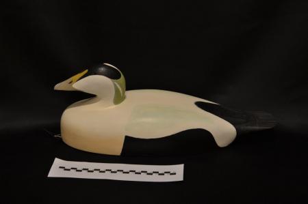 Två trävettar. Föreställer ejdrar.