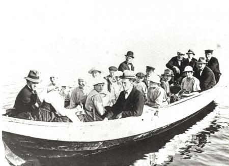 Svartvitt fotografi på en grupp finklädda människor sittande i en träbåt.