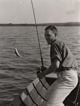 Svartvitt fotografi på en man (ej namngiven) som fått napp då han fiskat med fiskespö från en båt.