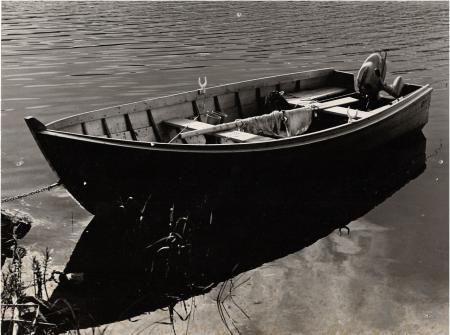 Svartvitt fotografi på en träbåt som ligger i vattnet, den har en motor.