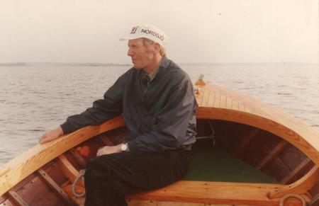 Färgfotografi på Sven Bergman (namngiven på baksidan) som sitter i en träbåt.