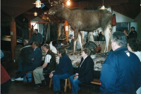 Färgfotografi på en grupp besökare på första jaktens dag på museet.