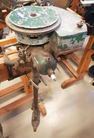 Utombordsmotor, tillverkad av Archimedes, Stockholm. Har tidigare haft startknapp men har omgjorts med platta för startsnöre.