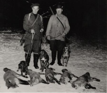 Baksidetext: En lyckad jaktdag. Fr.v. Ruben Eriksson och Valter Häggblom. Hundarna Traper och Molly.