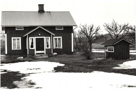 Svartvitt fotografi på ett litet hus med vita knutar på okänd ort.
